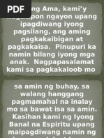 Linisin Mo ang aming mga dila sa mapapait na salita at pahayag na maaaring makasakit Dalisayin Mo ang aming pusong maramdamin at mapagtanim ng galit alisin ang hindi banal at nagpapabanal Pagaanin Mo ang aming mga. Inaasahan namin na dadalo kayo sa pagpupulong. Opening prayer for the meeting.
