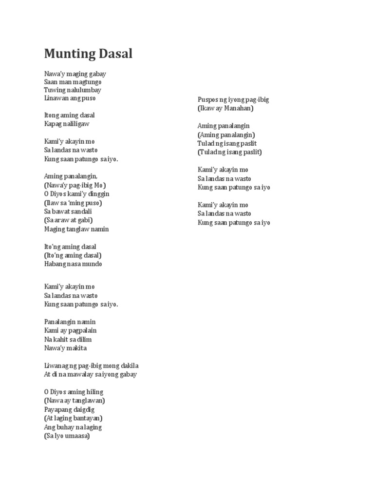 Mulatin ang diwa ibangon ang dangal Aping bayan lumaya ka. Verse 1 Ang tanging hiling ko lang ay sana ay mapagbigyan Ang pag-ibig kong ito na para lamang sayo Di man agad. Dasal na mula sa puso at wagas.