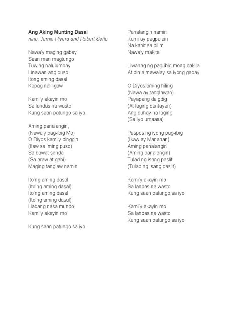 Download PDF - Ang Aking Munting Dasal Lyrics qn85wmpd91n1. A KARAOKE COVER SONG Good for low Speed Internet connectionBEST VIEWED IN HD format PC or MOBILE Cell phones. Jamie Rivera and Robert Seña Naway maging gabay Saan man magtungo Tuwing nalulumbay Linawan ang puso Itong aming dasal Kapag naliligaw Kamiy akayin mo Sa landas na wasto Kung saan patungo sa iyo.